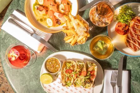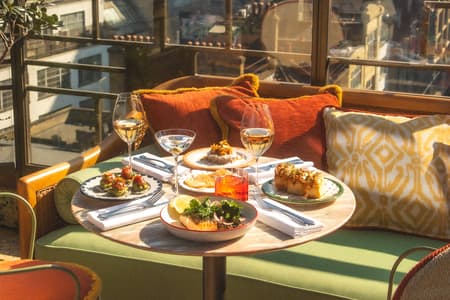 In the 19th century, Broadwick Street was home to a noted flute-maker who inspired the name of the rooftop dining and bar venue that crowns the hotel. Flute's landscaped wraparound outdoor terrace offers spectacular views over the Soho streets and London skyline. Inside, the décor combines cocooned comfort with maximalist glamour - animal-print upholstery, cork walls and mirrored ceilings united by an extravagant palm-frond carpet. From the onyx-topped central bar, Flute's bartenders serve up an ever-changing list of innovative cocktails complemented by a sensational soundtrack of music and menus featuring food designed to be enjoyed with friends.